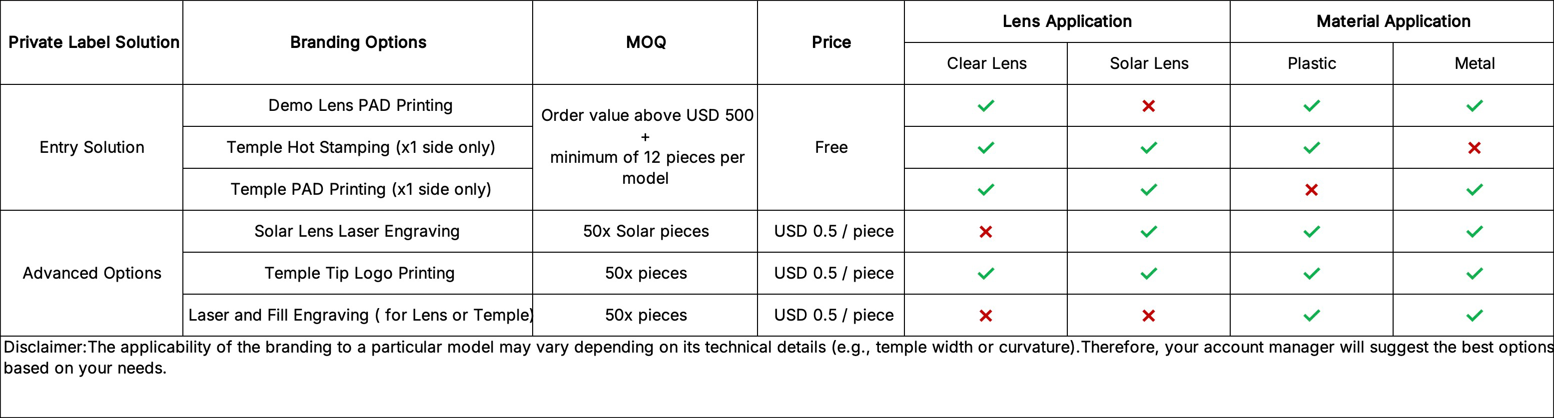 SUNMIRR Private Label is FREE for orders starting from USD 500 and a minimum of 5 pieces per frame color.